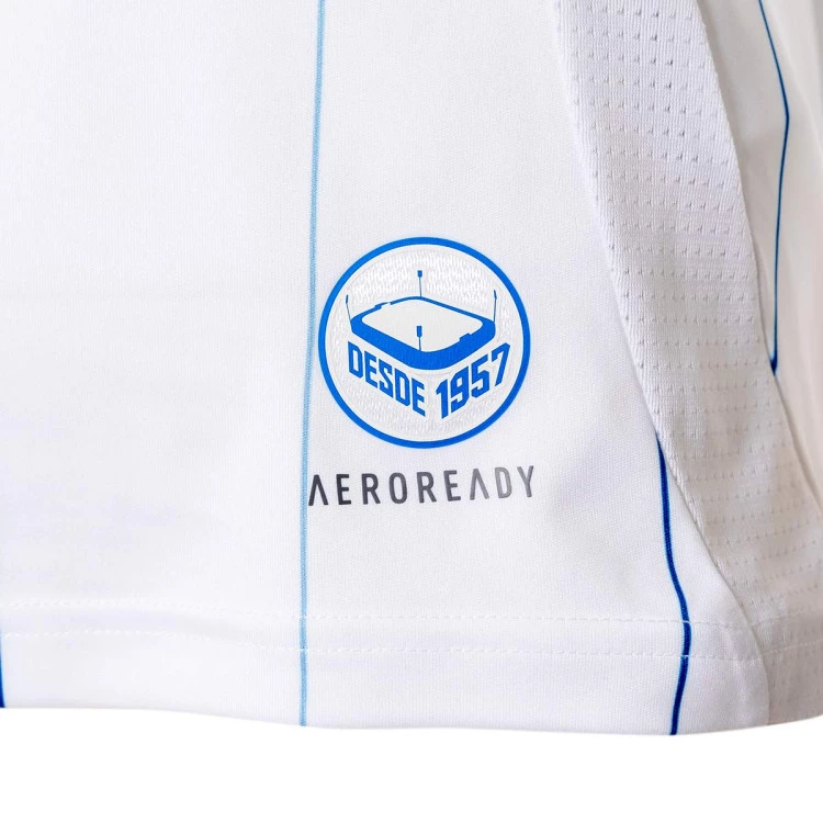 Thuisshirt van Real Zaragoza 2024-2025. Klassieke snit en regular fit patroon. Overwegend in de kleuren van Zaragoza, witte jersey met blauwe details en dunne verticale strepen. Rubberen embleem op de borst en detail van de drie strepen van het merk adidas op de schouders.