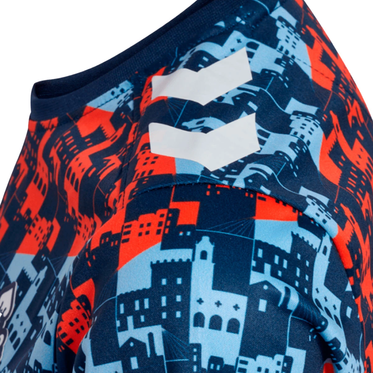 Het Celta De Vigo 2024-2025 Pre-Match Shirt combineert blauwe en rode grafische sublimatie prints. Het shirt heeft een ronde hals en zowel het Hummel- als het clublogo zijn op de borst te vinden.