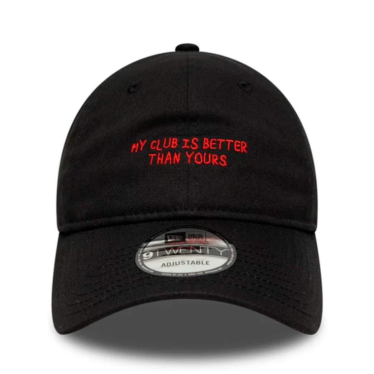 De AC Milan Black pet van New Era is een onmisbaar item voor elke voetbalfan en in het bijzonder voor de supporters van het legendarische A.C. Milan. Met een gedurfd en elegant ontwerp heeft deze pet in klassiek zwart de tekst "MY CLUB IS BETTER THAN YOURS" geborduurd in opvallend rood, een zelfverzekerde knipoog die niet onopgemerkt blijft.