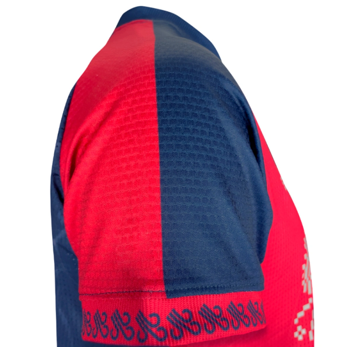 Cagliari Thuisshirt voor het seizoen 2025-2026 van EyeSport is een waar juweeltje voor de trouwe fans van de club. Dit shirt belichaamt alle passie van het team met zijn opvallende ontwerp in marineblauw en heeft een gesublimeerde print geïnspireerd op de reflecties van de zee van Sardinië.