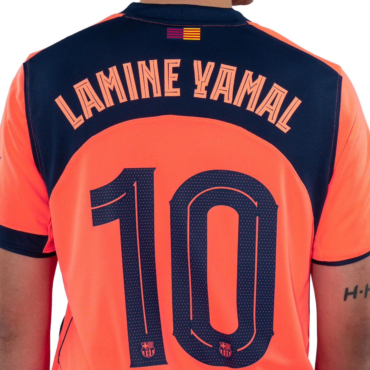 Draag met trots de kleuren van FC Barcelona met het derde shirt voor de Champions League 2025-2026, gepersonaliseerd met de officiële naam en rugnummer van Lamine Yamal.
