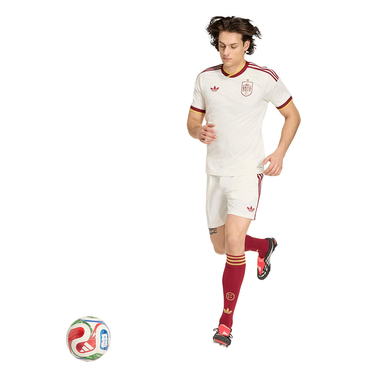 De adidas korte broek van het uittenue van Spanje voor het Wereldbeker 2026 bevat designdetails die de rijkdom van de Spaanse taal vieren en geïnspireerd zijn op de elegantie van klassieke literatuur.