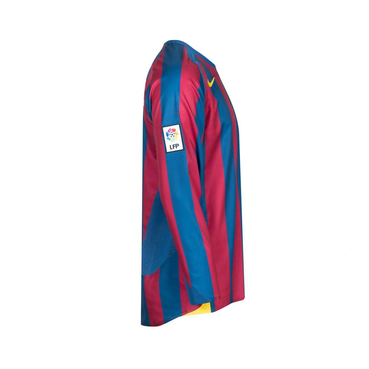 Een legendarisch stuk dat een eerbetoon is aan het spel dat de wereld verliefd maakte. Dit ontwerp met lange mouwen behoudt alle details die het onvergetelijk maakten: de klassieke blaugrana kleuren, de oude La Liga patch en, zoals niet mocht ontbreken, de officiële “Ronaldinho” bedrukking en zijn mythische rugnummer #10 op de achterkant.
