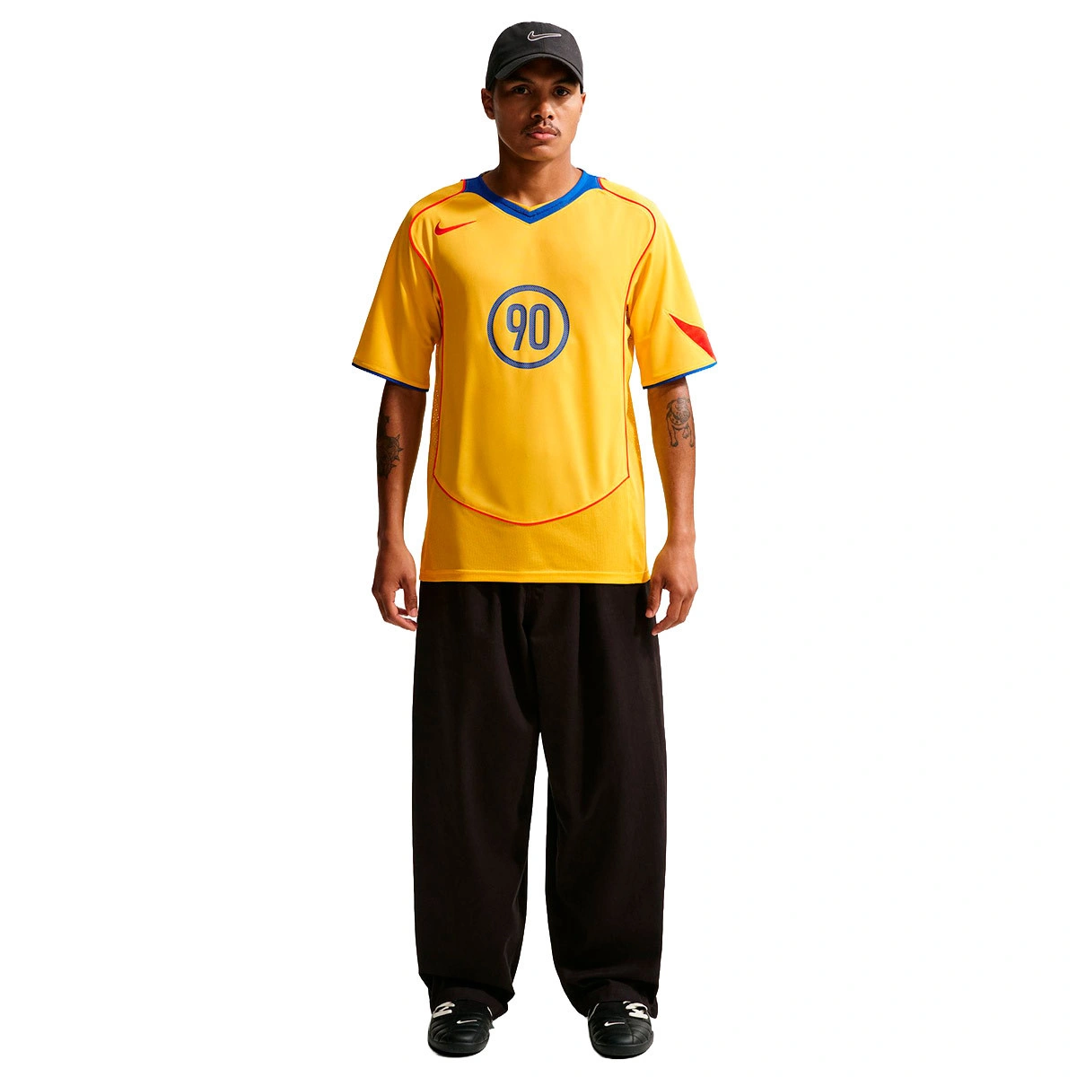 • Het Nike Total 90 (T90) tenue werd halverwege de jaren 2000 gelanceerd en werd gedragen door verschillende Nike teams en clubs. Iconische kenmerken zijn het Swoosh-logo op de rechterborst, biesdetails en een kleurblokontwerp op de achterkant.