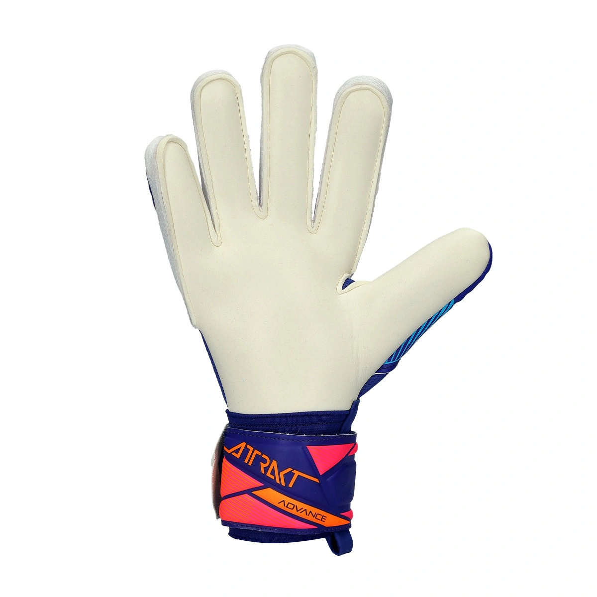 Keepershandschoenen Attrakt Advance van het merk Reusch. Handschoenen voor volwassenen in de kleur sharp blue-white-shocking orange met een negative cut.