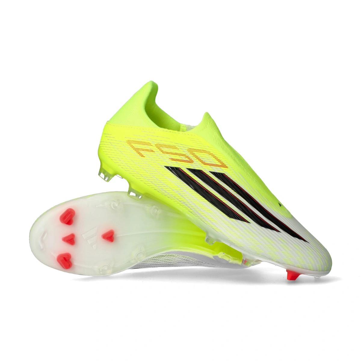 adidas F50 League LL FG/MG Voetbalschoen in de kleur Team Solar Yellow-Core Black-Lucid Red. Instapmodel voetbalschoen zonder veters voor natuurgrasvelden en tweede generatie kunstgrasvelden.