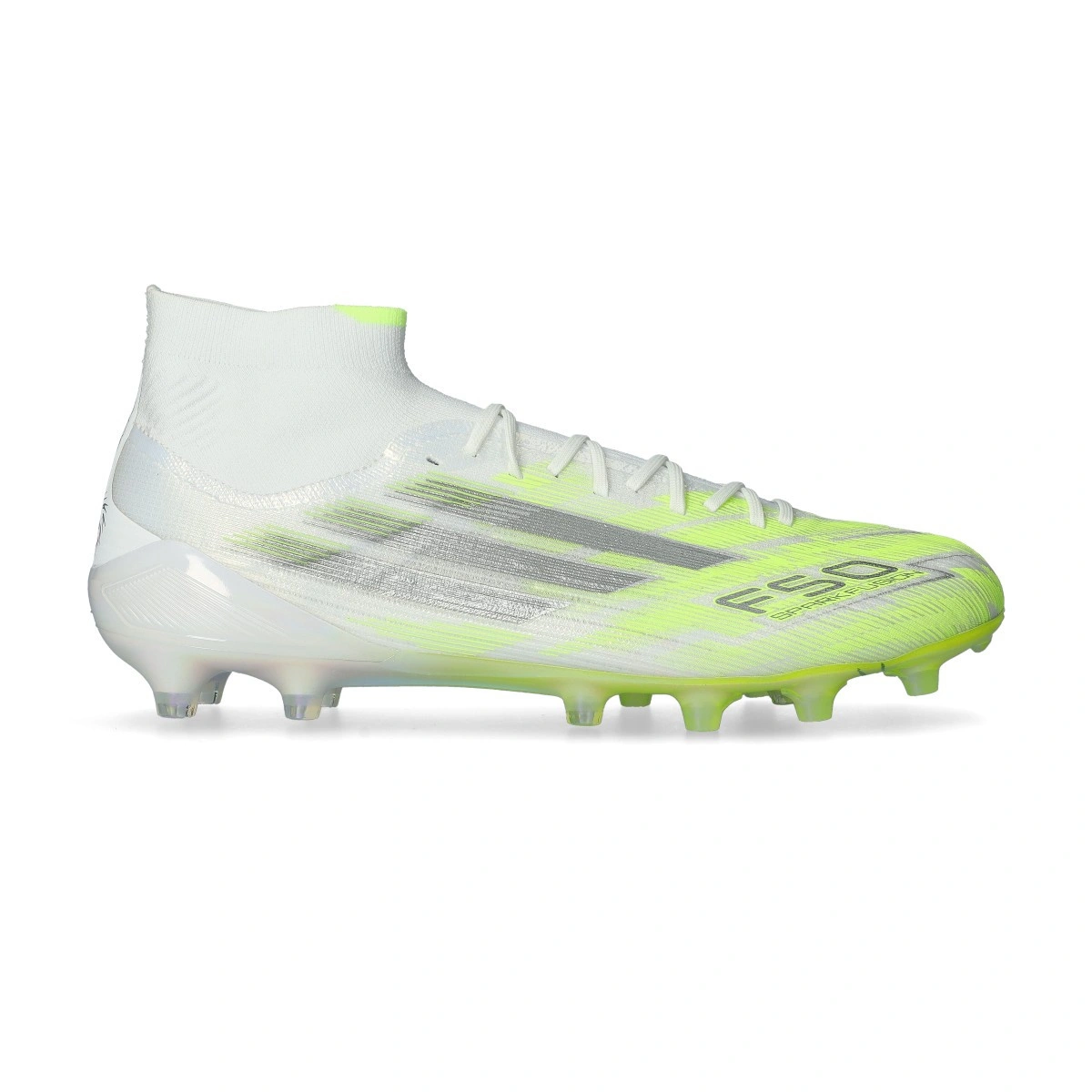adidas F50 Elite voetbalschoenen L FG/AG voor dames. Gebreide schoenen met veters voor gebruik op natuurgras en kunstgras. Topklasse schoenen in de kleur White-Iron Met-Hi-Res Yellowe.