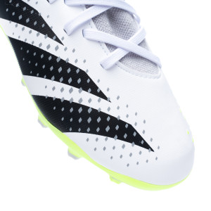 adidas Predator Accuracy.3 MG voetbalschoenen voor kinderen. Gebreide laarzen, met sok, voor gebruik op natuurgras, kunstgras of onverharde velden. Lage laarzen in de kleur Ftwr wit-Core zwart-Lucid citroen. Voor controlespelers.