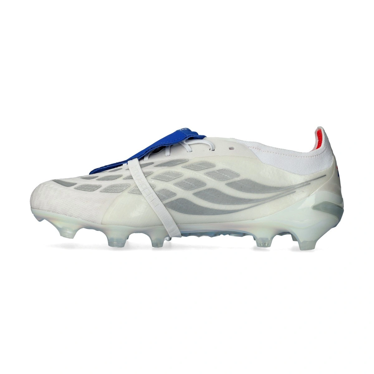 adidas Predator Elite FT FG Jude Bellingham voetbalschoen. Synthetische schoenen met veters voor gebruik op natuurgrasvelden. High-end schoenen in de kleur White-Zero Met-Team Royal Blue.