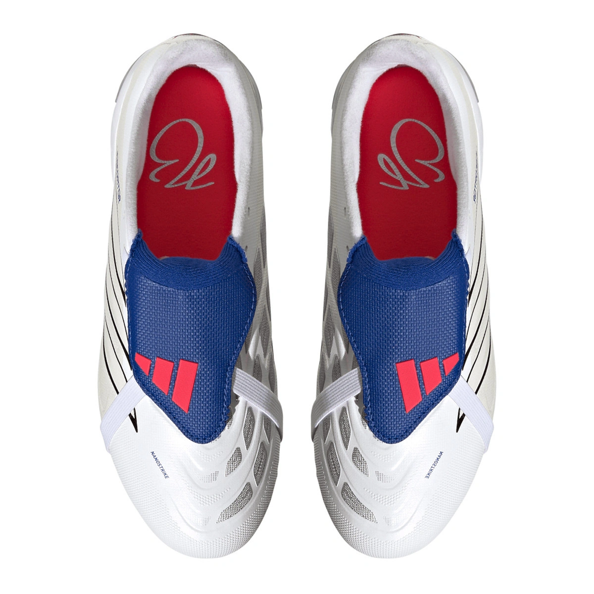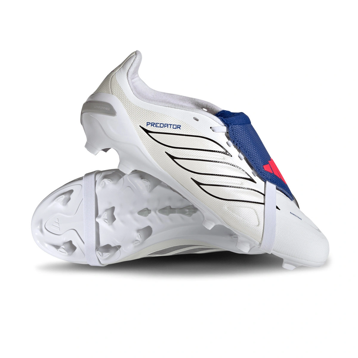 adidas Predator League FT FG voetbalschoen voor kinderen. Synthetische schoenen met veters voor gebruik op natuurgrasvelden. Instapmodel schoenen in de kleur White-Zero Met-Team Royal Blue.