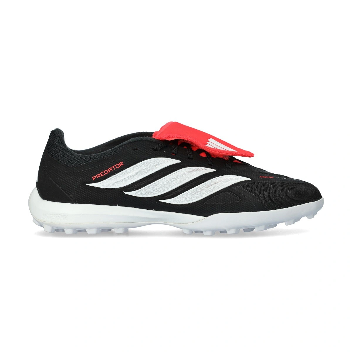 adidas Predator League FT Turf voetbalschoen. Synthetische schoenen met veters voor gebruik op kunstgrasvelden of tapijt. Basisklasse schoenen in de kleur Core Black-White-Lucid Red.
