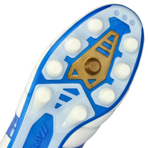 Mizuno Morelia II Elite FG Voetbalschoenen voor natuurlijk terrein. Hoogwaardig laars in de kleur White-Laser Blue-Gold.