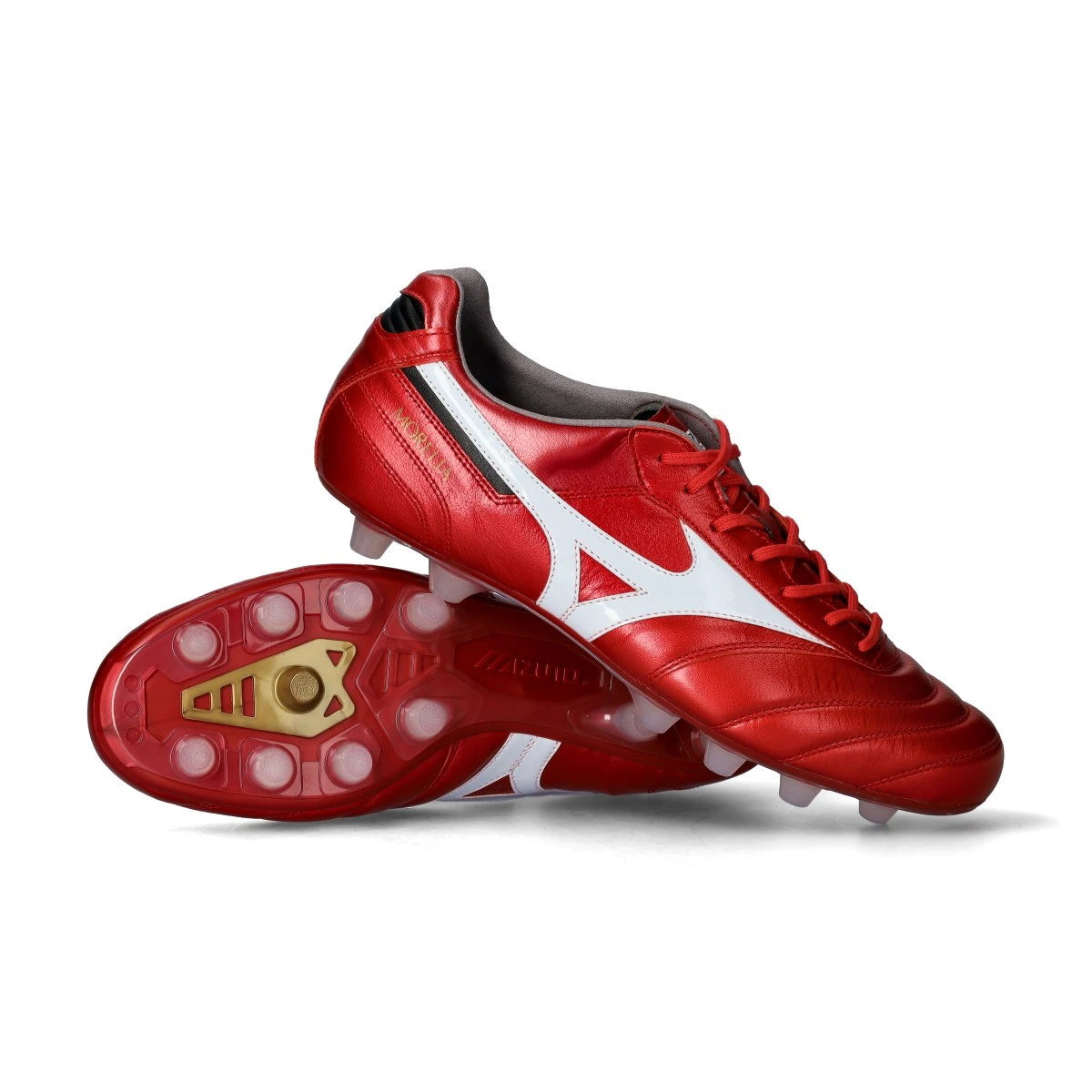 Mizuno Morelia II Japan voetbalschoenen gemaakt van kangoeroeleer voor natuurgras, dirt en zelfs kunstgras in Rood-Wit-Zwart.