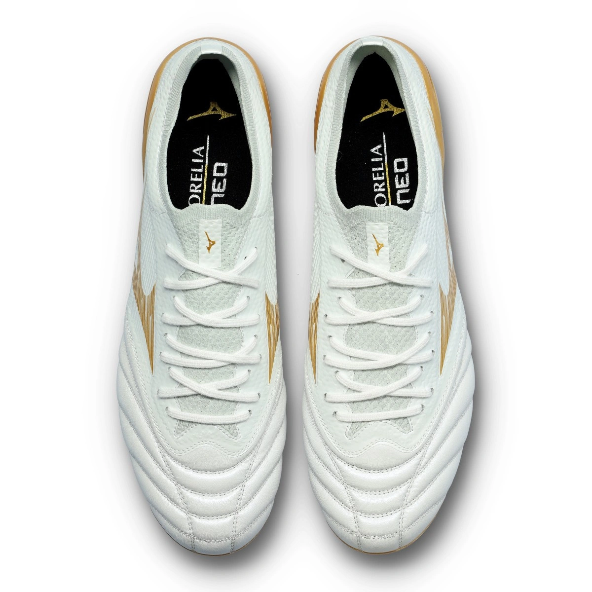 Kangoeroeleer Mizuno Morelia Neo IV Beta Elite Mix voetbalschoenen voor nat natuurlijk gras in de kleur White-MP Gold-Cool Gray.