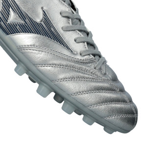 Mizuno Morelia Neo IV Pro AG voetbalschoen voor gebruik op kunstgrasvelden in de Galaxy Silver-Cool Grey kleurstelling.