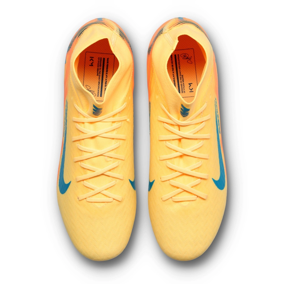 Ontworpen voor Kylian Mbappé's pure snelheid, de nieuwe laarzen van de Franse ster komen in een levendige oranje kleur, al aanwezig in eerdere edities. Met een lichtgewicht en explosief ontwerp viert deze collectie Mbappé's nieuwe tijdperk bij Real Madrid, waarbij hoogwaardige technologie wordt gecombineerd met exclusieve details: zijn persoonlijk logo, verwijzingen naar Frankrijk en de witte club. Ontworpen voor iedereen die het verschil wil maken. Haal de jouwe nu in huis!