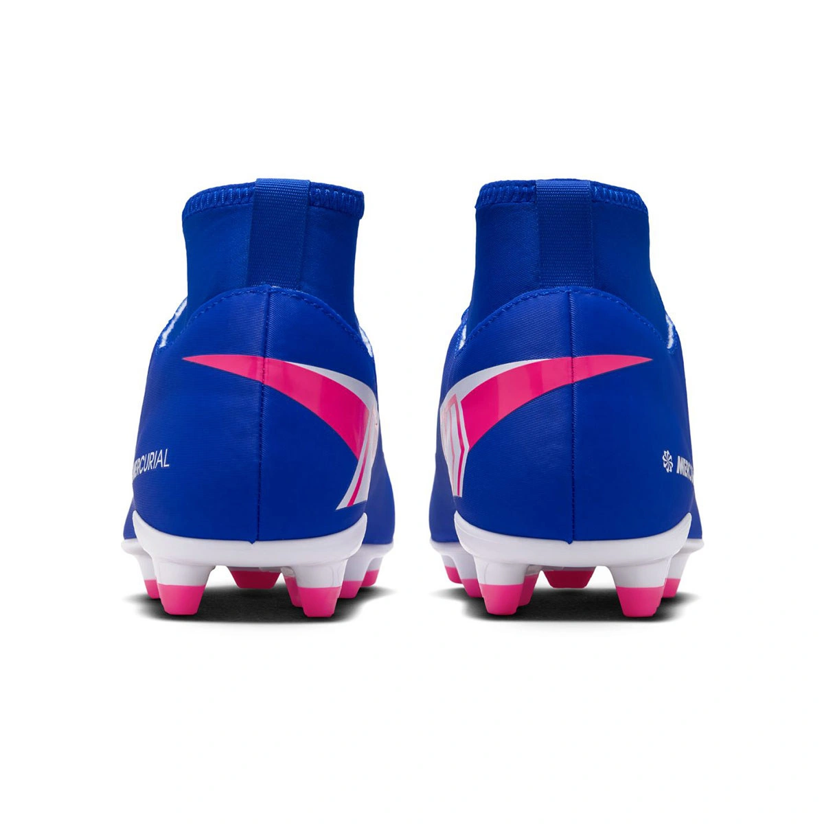 Nike Air Zoom Mercurial Superfly 10 FG/MG Academy schoen voor kinderen. Schoenen van gebreid materiaal, te gebruiken op natuurgrasvelden of kunstgras van de tweede generatie. Basisklasse schoenen in de kleur Racer Blue-White.