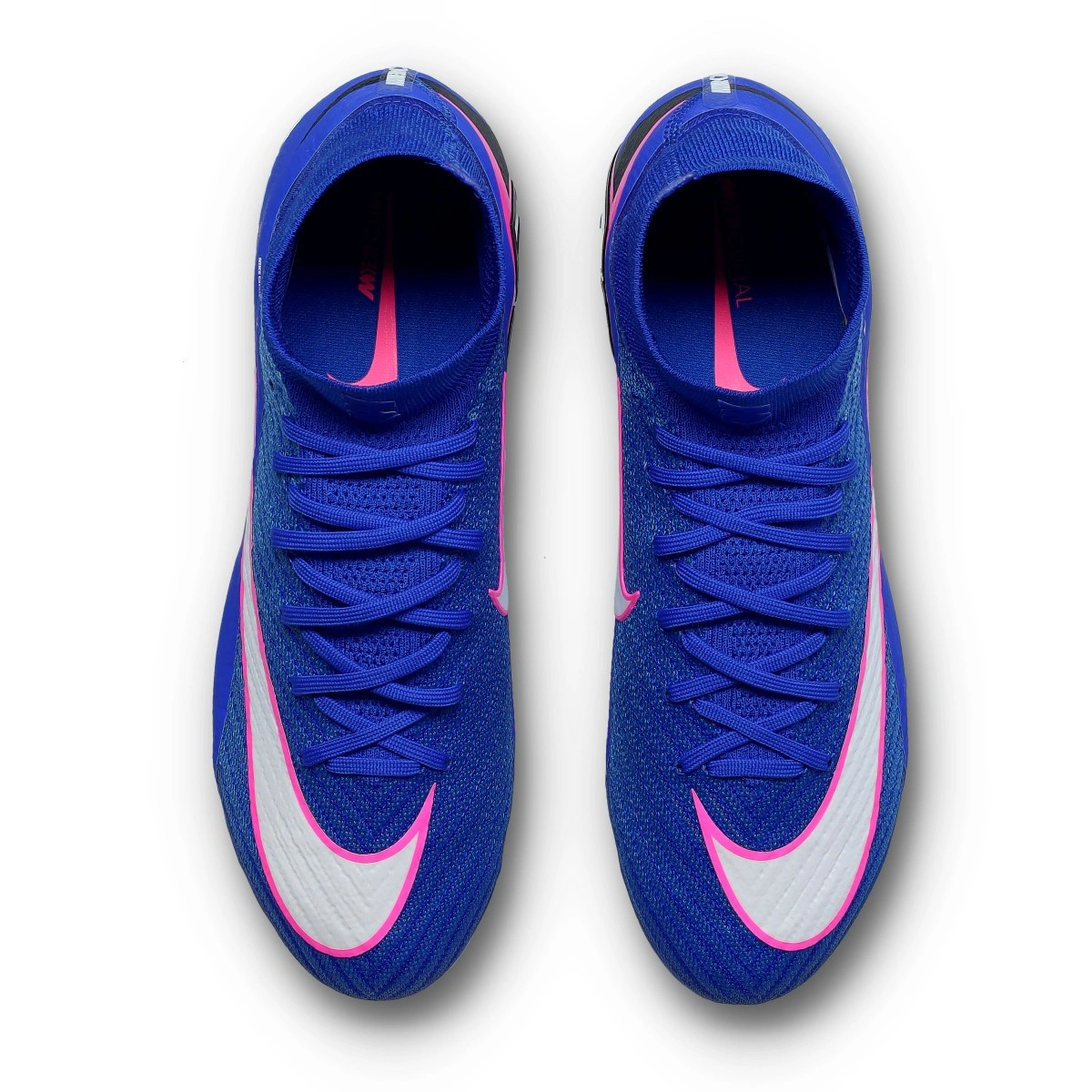 Nike Air Zoom Mercurial Superfly 10 Elite AG voetbalschoenen voor volwassenen. Gebreide schoenen, met sok, voor gebruik op kunstgrasvelden. Topklasse schoenen voor snelle spelers in Racer Blue-White.