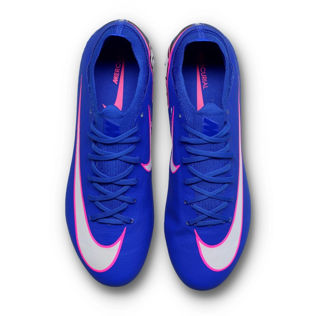 Nike Air Zoom Mercurial Vapor 16 Pro FG voetbalschoen. Gebreide schoenen voor gebruik op natuurgrasvelden. High-end schoenen in de kleur Racer Blue-White.