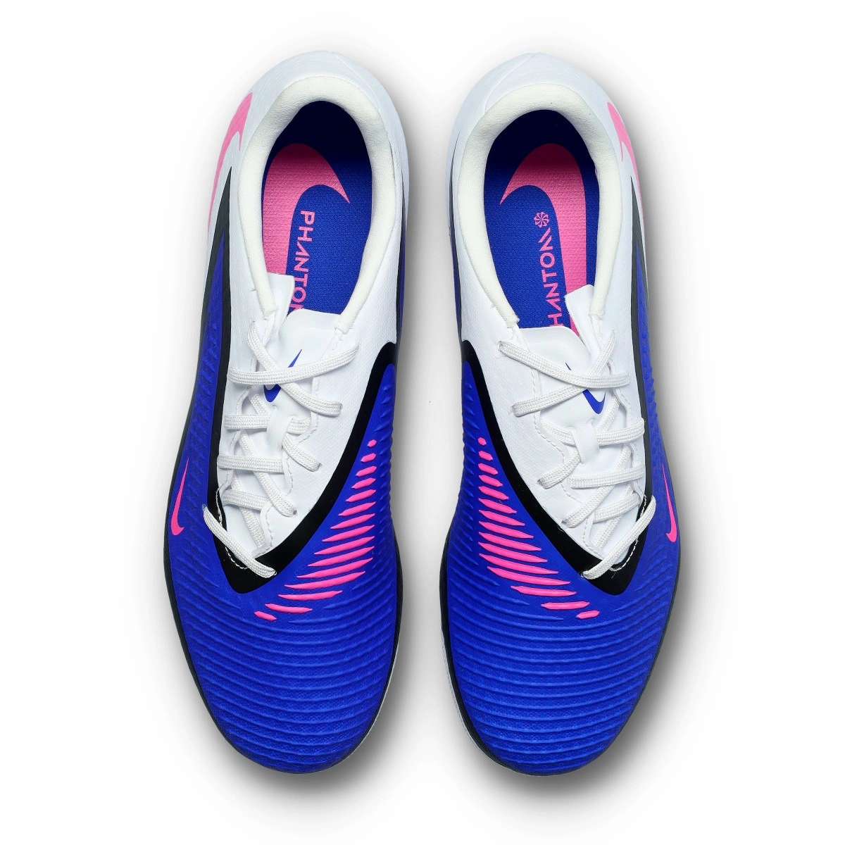 Nike Phantom 6 Low Academy AG voetbalschoen. Gebreide schoen zonder sok, voor gebruik op kunstgrasvelden. Middenklasse schoenen voor spelers die controle en precisie zoeken in de kleur Racer Blue-Pink Blast-White.