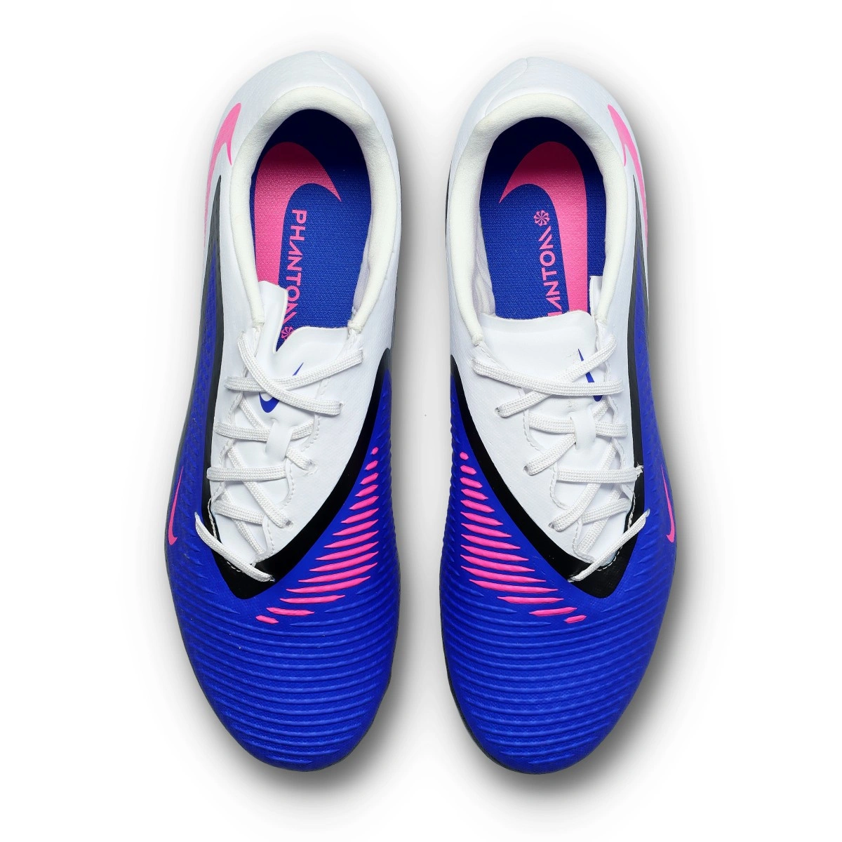 Voetbalschoen Nike Phantom 6 Low Academy FG/MG. Schoen van gebreid materiaal zonder sok, voor gebruik op droog natuurgras of eerste generatie kunstgrasvelden. Hoogwaardige schoenen voor spelers die controle en precisie zoeken in de kleur Racer Blue-Pink Blast-White.