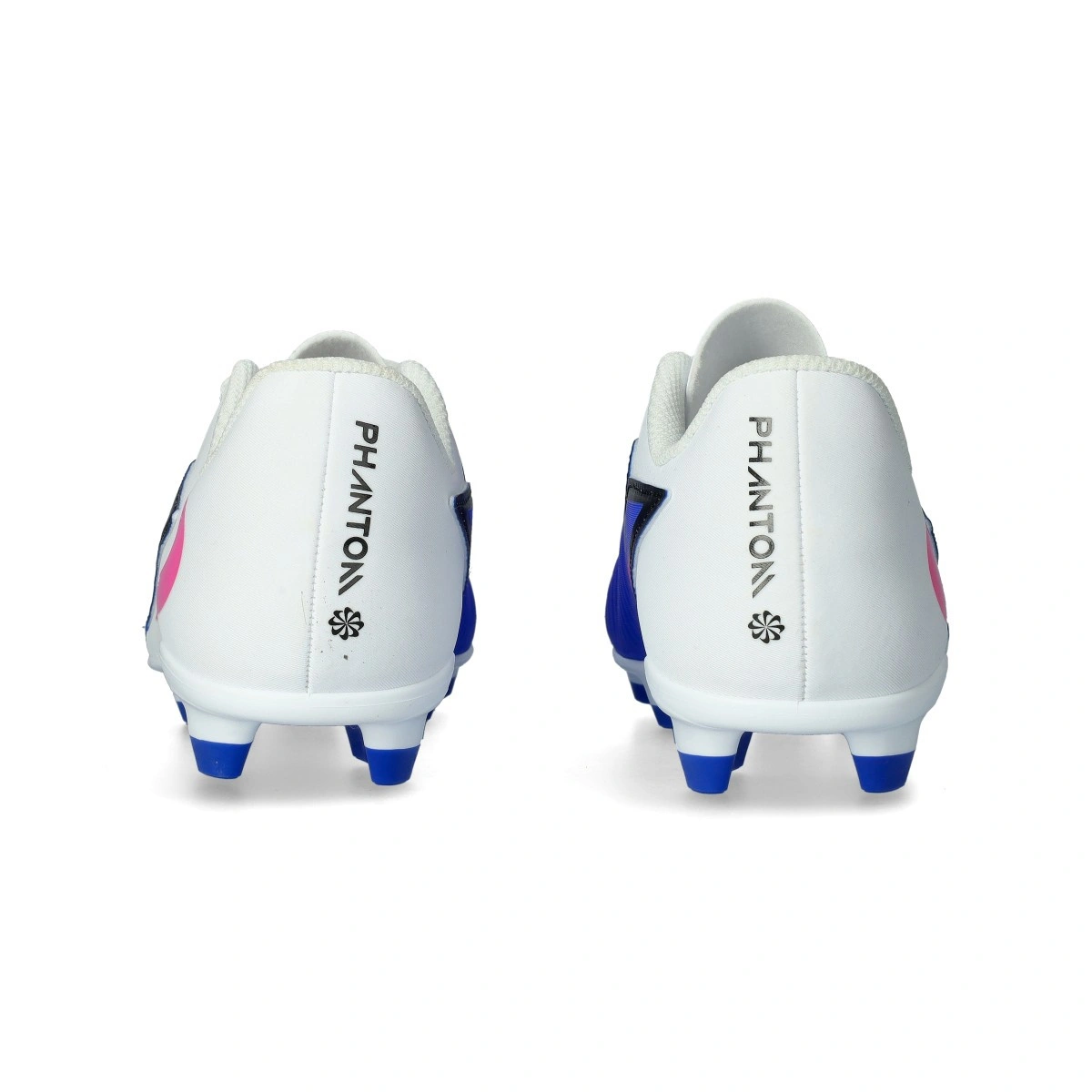 Voetbalschoen Nike Phantom 6 Low Club FG/MG voor kinderen. Schoen van gebreid materiaal zonder sok, te gebruiken op droog natuurgras of kunstgras van de eerste generatie. Hoogwaardige schoenen voor spelers die controle en precisie zoeken in de kleur Racer Blue-Pink Blast-White.