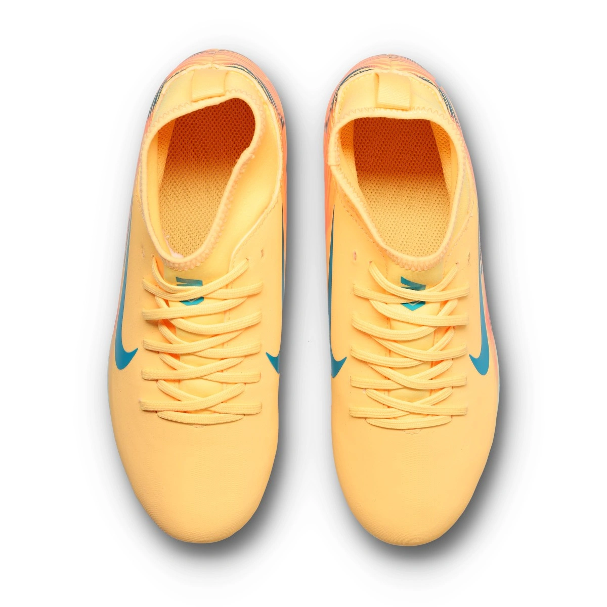 Kids' Nike Air Zoom Mercurial Superfly 10 Club FG/MG voetbalschoen. Synthetische schoenen met sok om te gebruiken op vuil, kunstgras van elke generatie of natte of droge natuurgrasvelden. Basisschoenen in Melon Tint-Neo Turq-Igloo kleurstelling.