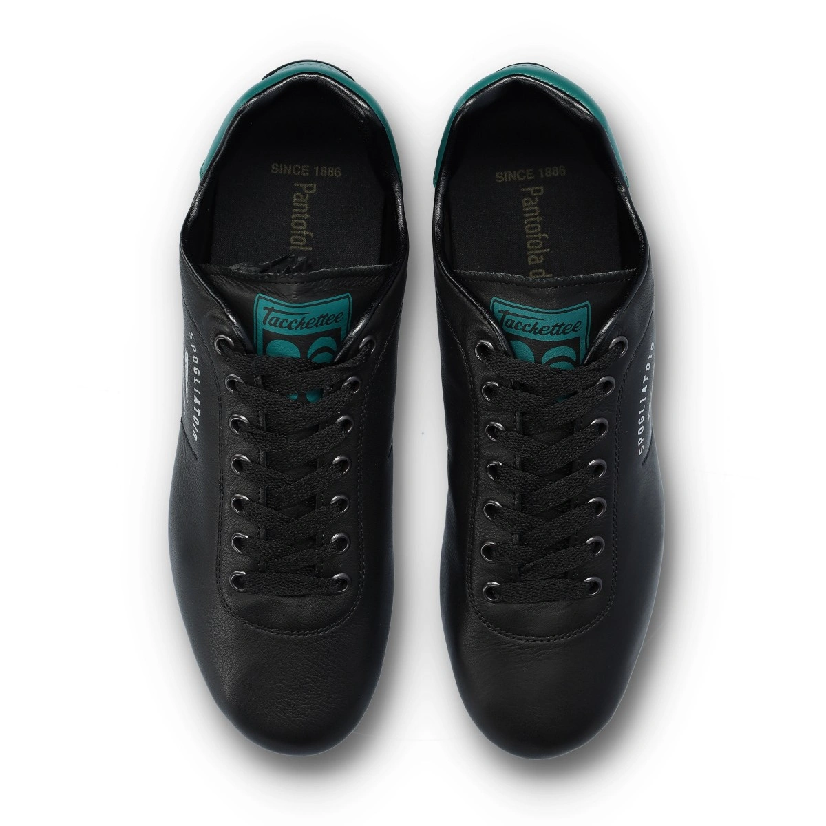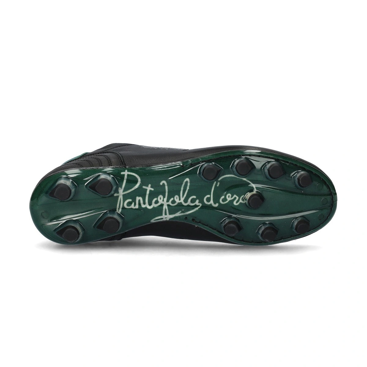 Pantofola Lazzarini x Tacchettee FG/AG voetbalschoen. Zwarte leren schoen voor gebruik op natuurlijke en kunstgrasvelden.