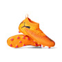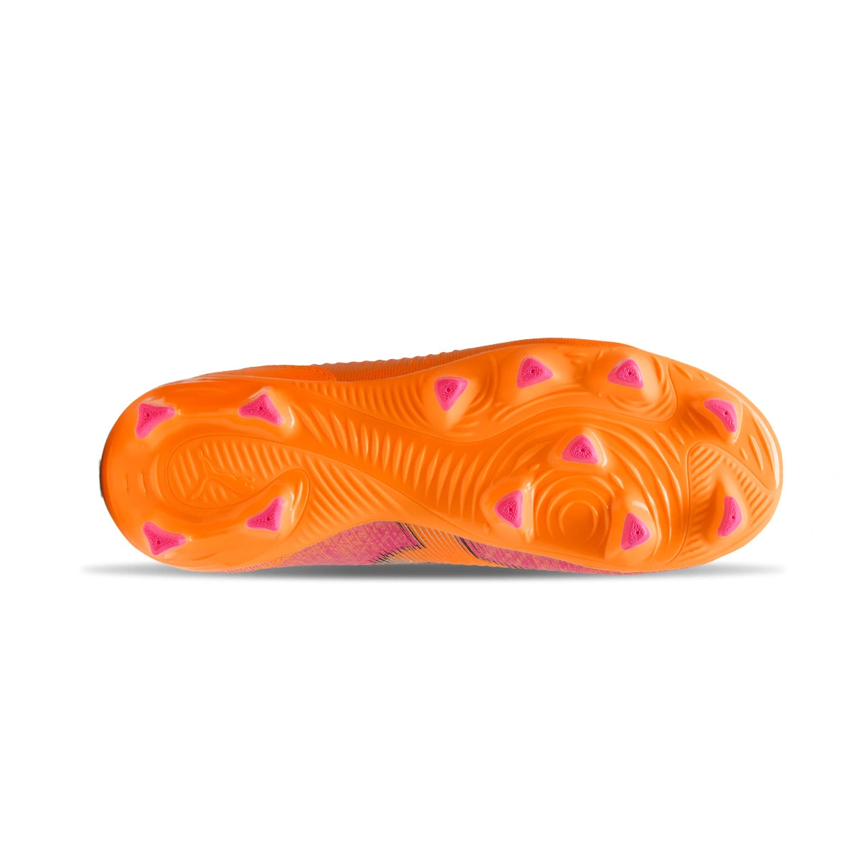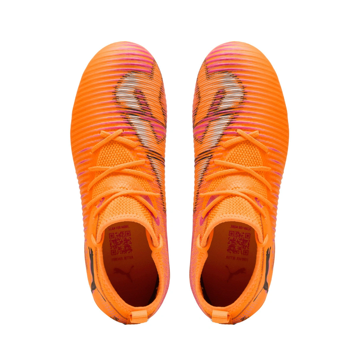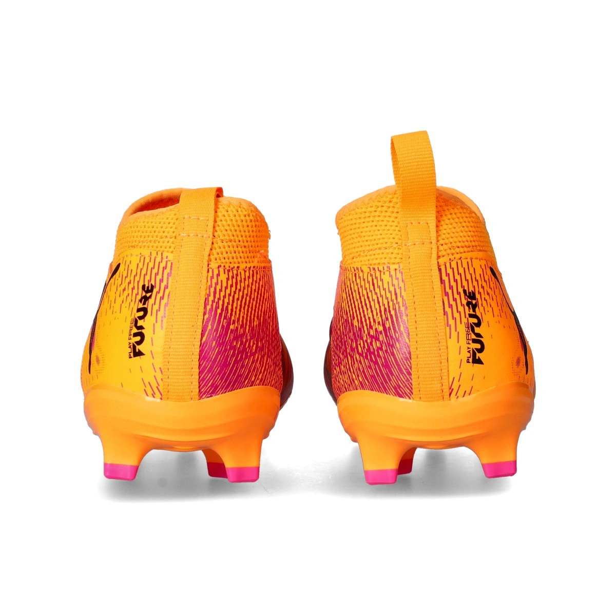 Puma Future 8 Match FG/AG voetbalschoen voor kinderen. Synthetische schoenen voor gebruik op kunstgras- en natuurgrasvelden. Instapschoenen in Heat Fire-Black-Ravish kleurstelling.