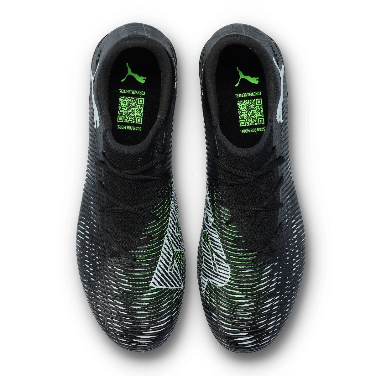 Puma Ultra 8 Match Low FG/ AG voetbalschoen voor volwassenen. Synthetische schoenen voor gebruik op kunstgras en natuurgrasvelden. Lage laarzen in de kleuren Zwart-Zilver-Fluo Groen .