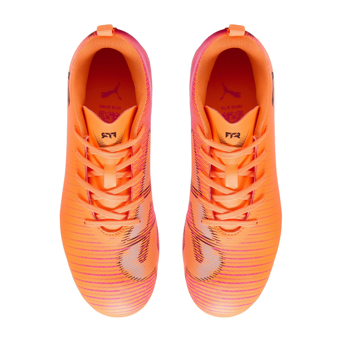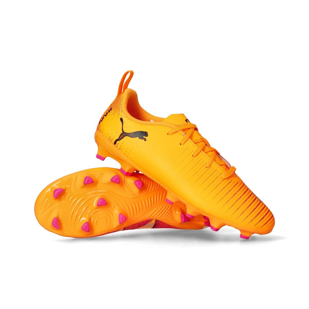 Chaussures de football Puma Future 8 Play FG/AG pour enfants. Chaussures synthétiques pour utilisation sur gazon artificiel et naturel. Chaussures bas de gamme couleur Heat Fire-Black-Ravish.