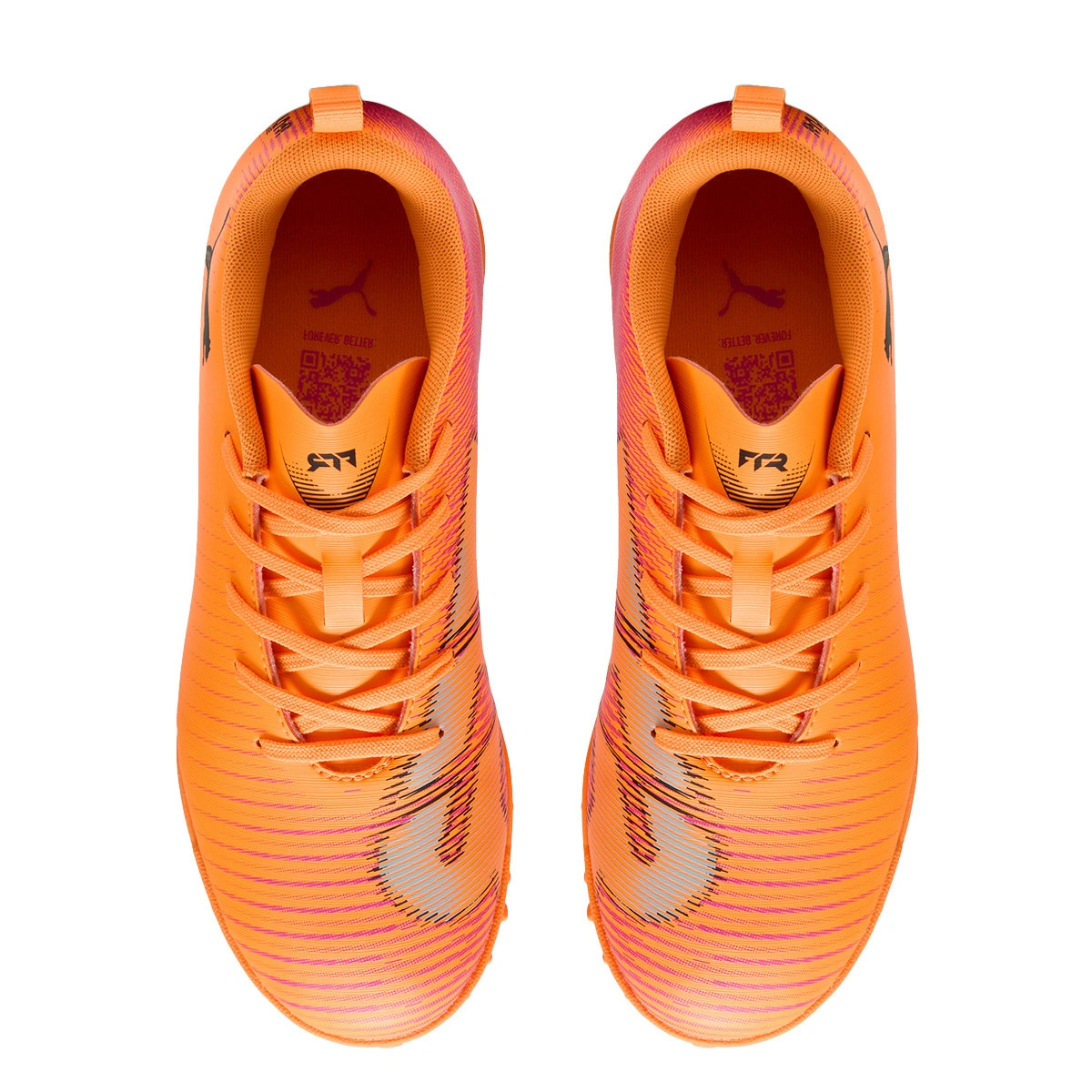 Toekomst 8 Play Turf voetbalschoen voor kinderen. Synthetische microvezel schoenen met veters voor gebruik op tapijt, kunstgras, beton of vuilvelden. Instapschoenen in Heat Fire-Black-Ravish kleurstelling.