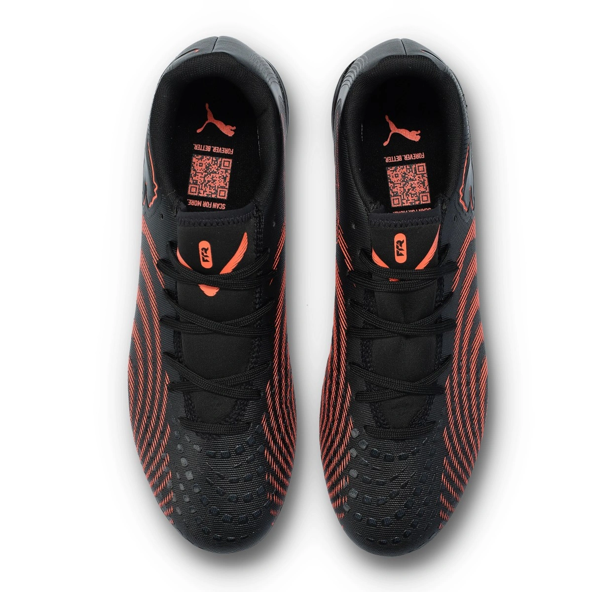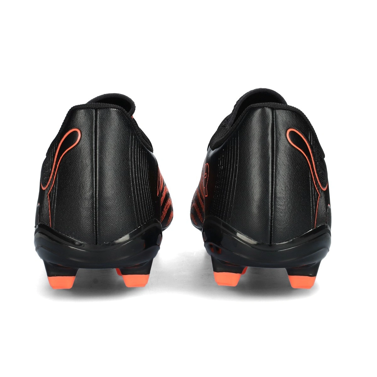 Puma Future Play 9 FG/AG voetbalschoenen. Synthetische schoenen voor gebruik op kunstgras en natuurgras. Instapmodel schoenen in de kleur Puma Black-Glowing Red-Strong Gray.