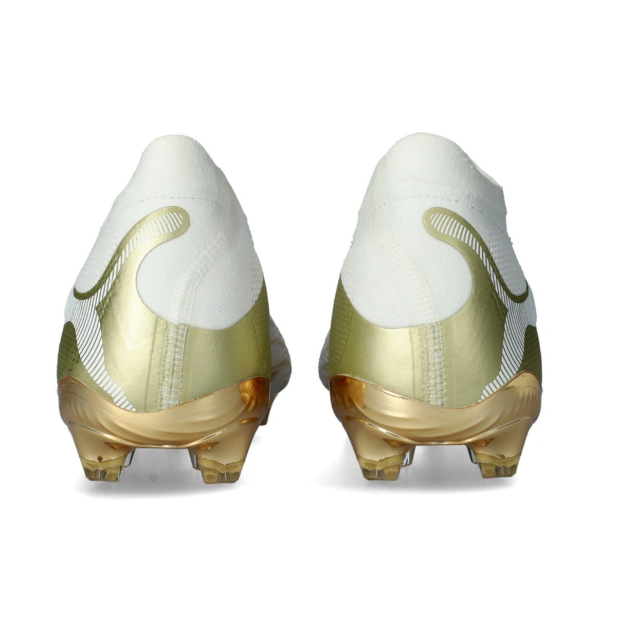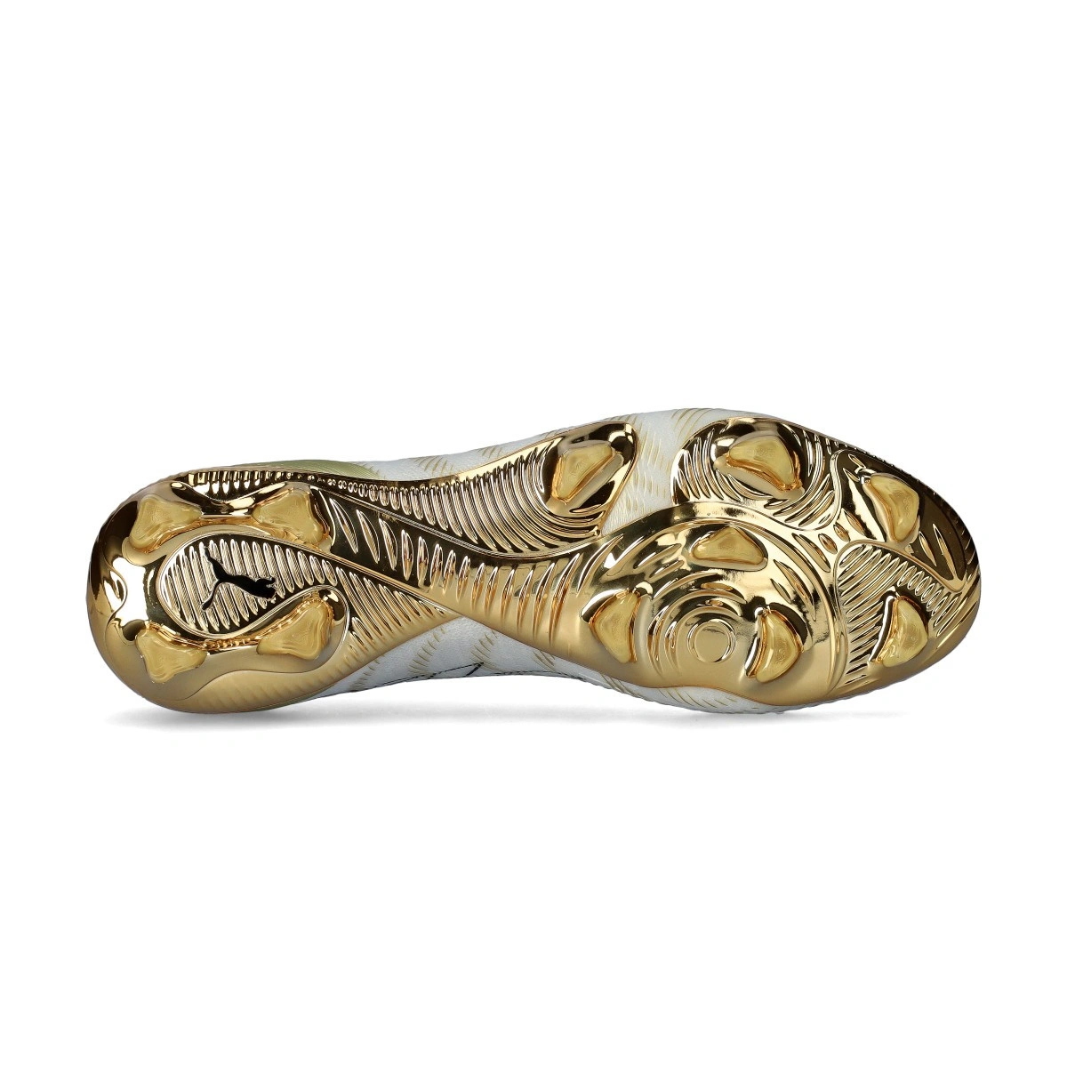 Puma Future Ultimate voetbalschoenen 9 FG. Schoenen van gebreid materiaal, voor gebruik op droge natuurgrasvelden. Schoenen van topklasse in de kleur White-Metallic Gold-Black.