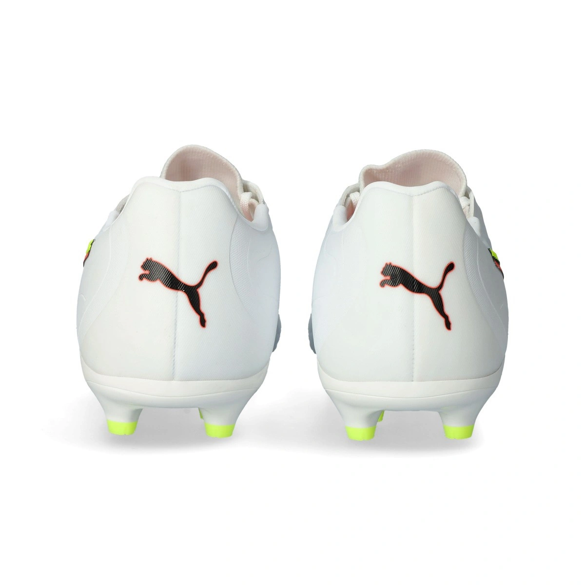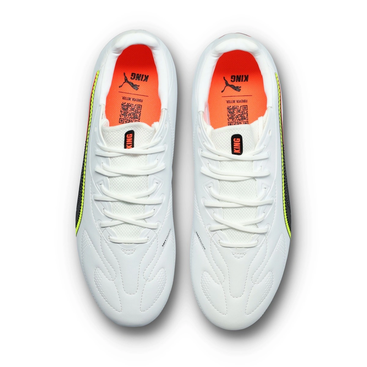 Puma King Match FG/AG 20 kindervoetbalschoen voor gebruik op kunstgrasvelden en tapijt. Instapmodel voetbalschoenen in de kleur Puma White-Glowing Red-Yellow Alert.