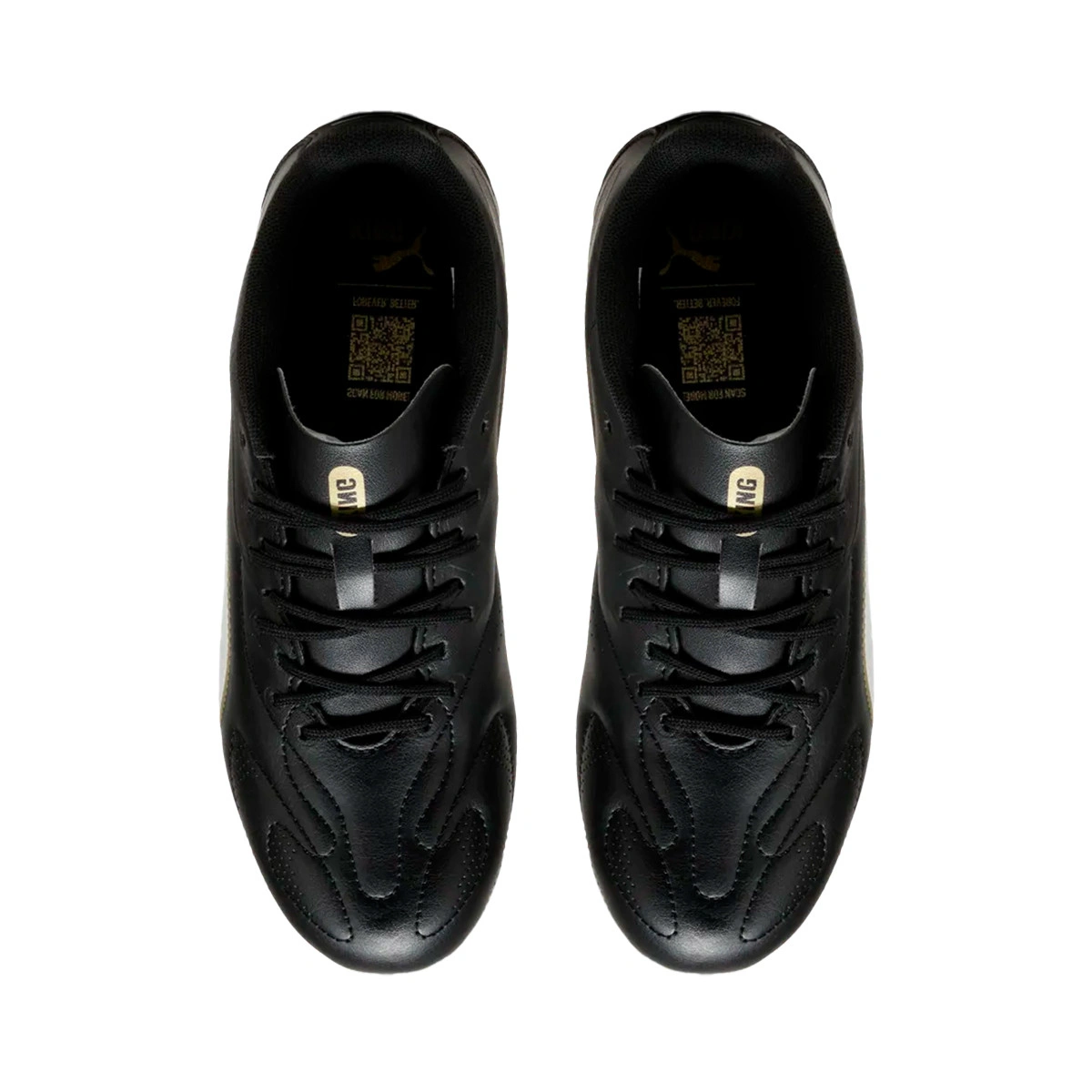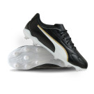 Puma King 20 Play FG/AG voetbalschoen voor kinderen. Synthetische schoenen voor gebruik op natuur- en kunstgrasvelden. Instapmodellen in de kleur Puma Black-Puma White-Puma Gold.