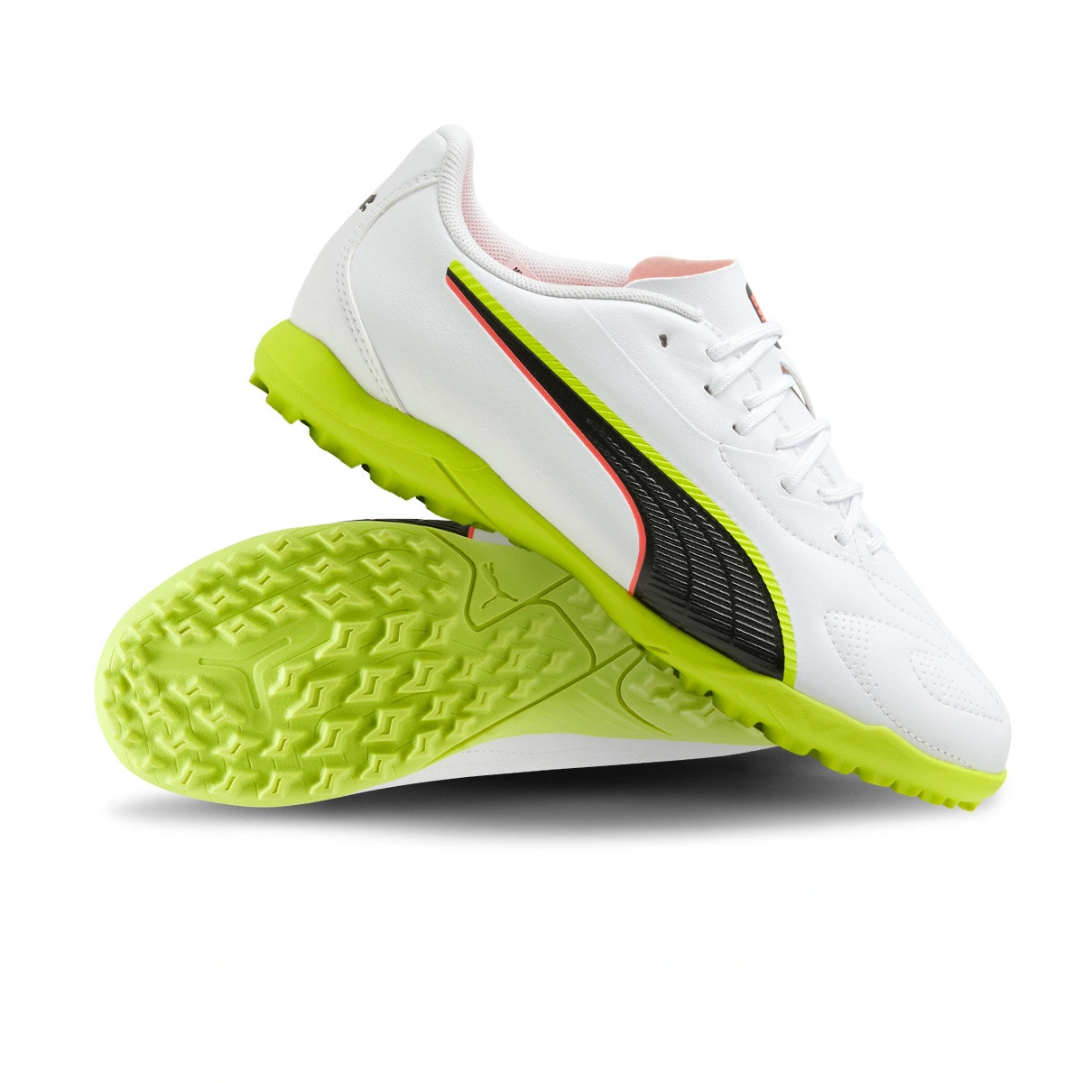 Puma King Play Turf voetbalschoen voor kinderen. Synthetische schoenen voor gebruik op kunstgras- en tapijtvelden. Instapmodel schoenen in de kleur Puma White-Glowing Red-Yellow Alert.