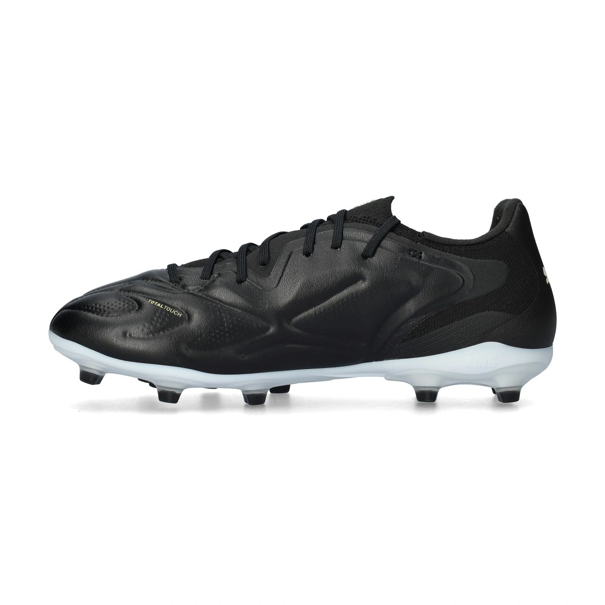 Puma King Pro 20 FG/AG Voetbalschoenen voor volwassenen. Voetbalschoenen van synthetisch leer voor natuurgrasvelden en de nieuwste generatie kunstgrasvelden. Voetbalschoenen uit het middensegment in de kleur Puma Black-Puma White-Puma Gold.