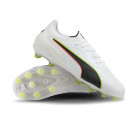 Puma King Pro 20 FG/AG voetbalschoen voor volwassenen. Voetbalschoenen van synthetisch leer voor natuurgrasvelden en de nieuwste generatie kunstgrasvelden. Voetbalschoenen uit het middensegment in de kleur White-Glowing Red-Yellow Alert.Het nieuwe pack van het merk met de katachtige combineert snelheid, controle en innovatie in één enkele release: de Ultra 6 komt in explosief geel voor degenen die grenzen verleggen met hun versnelling; de King, in puur wit, biedt een precieze en elegante touch om het spel te domineren; en de nieuwe generatie Future 9, in opvallend oranje, zorgt voor pasvorm en onvoorspelbaarheid voor de makers die wedstrijden veranderen.