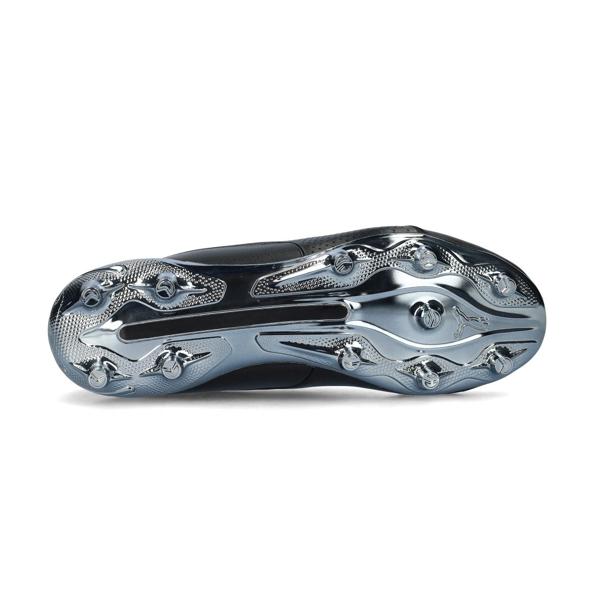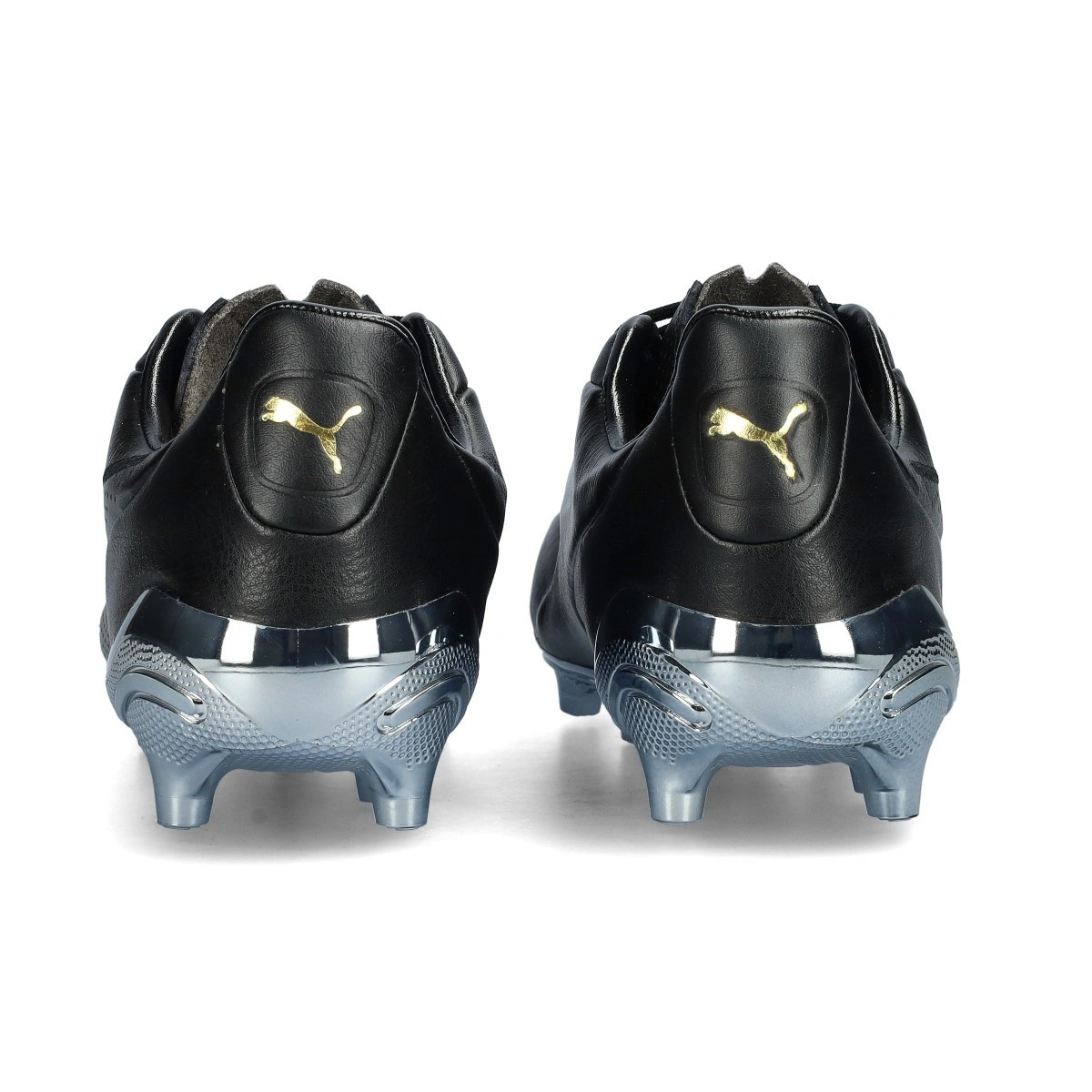 Voetbalschoen Puma King Platinum FG/AG. High-end schoen met veters voor natuur- en kunstgrasvelden in de kleur Black-Black-Metallic Gold.