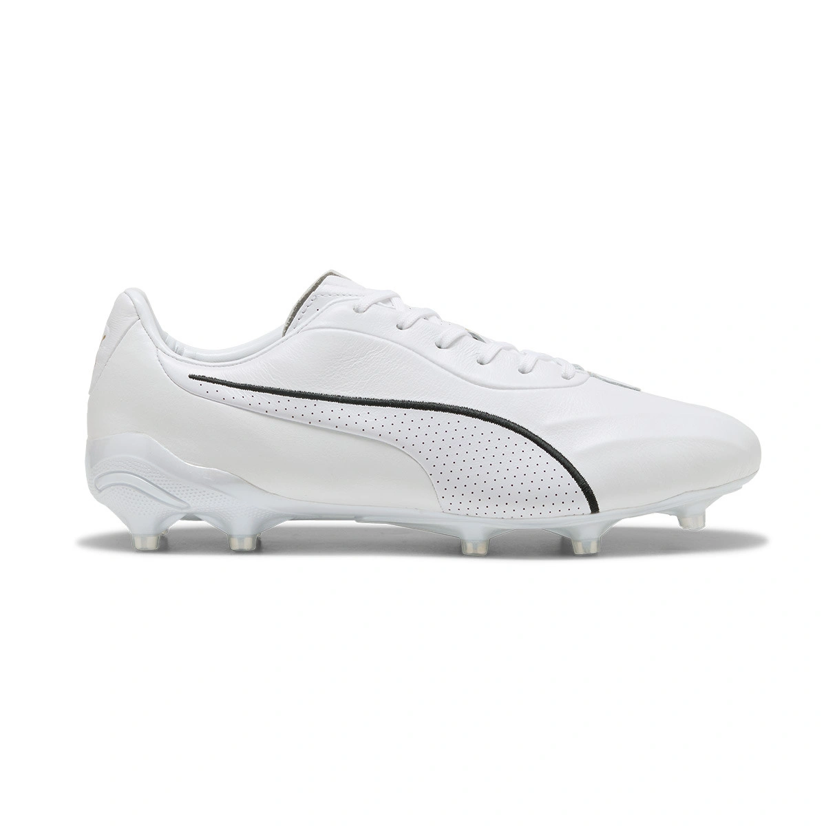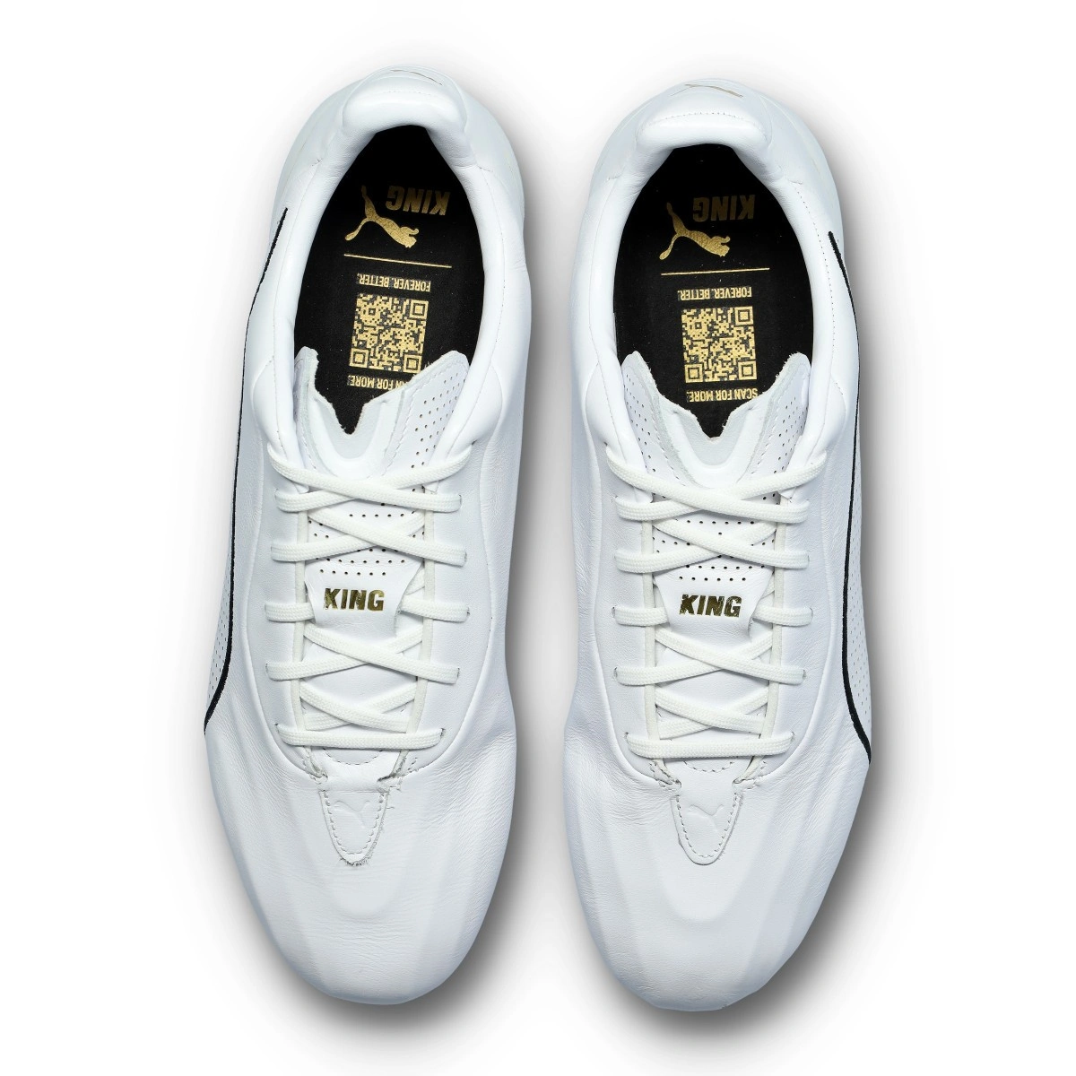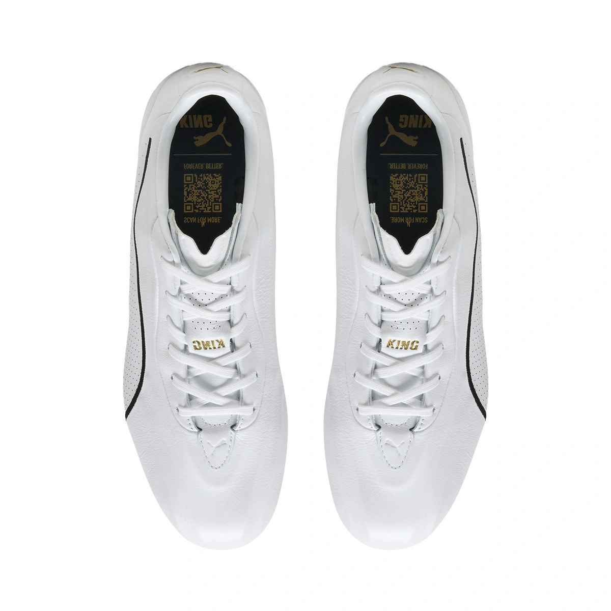 Puma King Platinum FG/AG voetbalschoen. Hoogwaardige schoen met veters voor natuur- en kunstgrasvelden in de kleur White-Metallic Gold-Black.