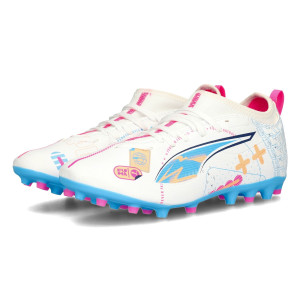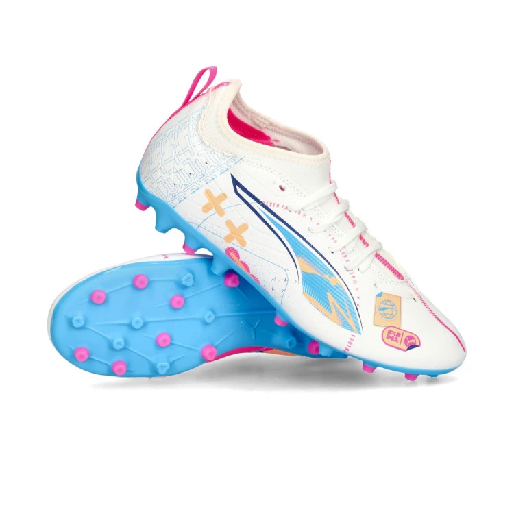 Puma Ultra 5 Match MG Voetbalschoen voor Kinderen . Synthetische schoenen voor gebruik op kunstgrasvelden van de eerste generatie. Lage laarzen in de kleur Wit-Luminous Blue-Poison Pink-Fizzy Melon.