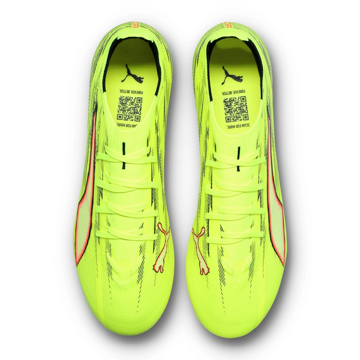 Puma Ultra 6 Match voetbalschoen. Synthetische schoenen voor gebruik op kunstgras en natuurgras. Instapmodel schoenen in de kleur Yellow Alert-Puma Black-Puma Silver-Glowing R.