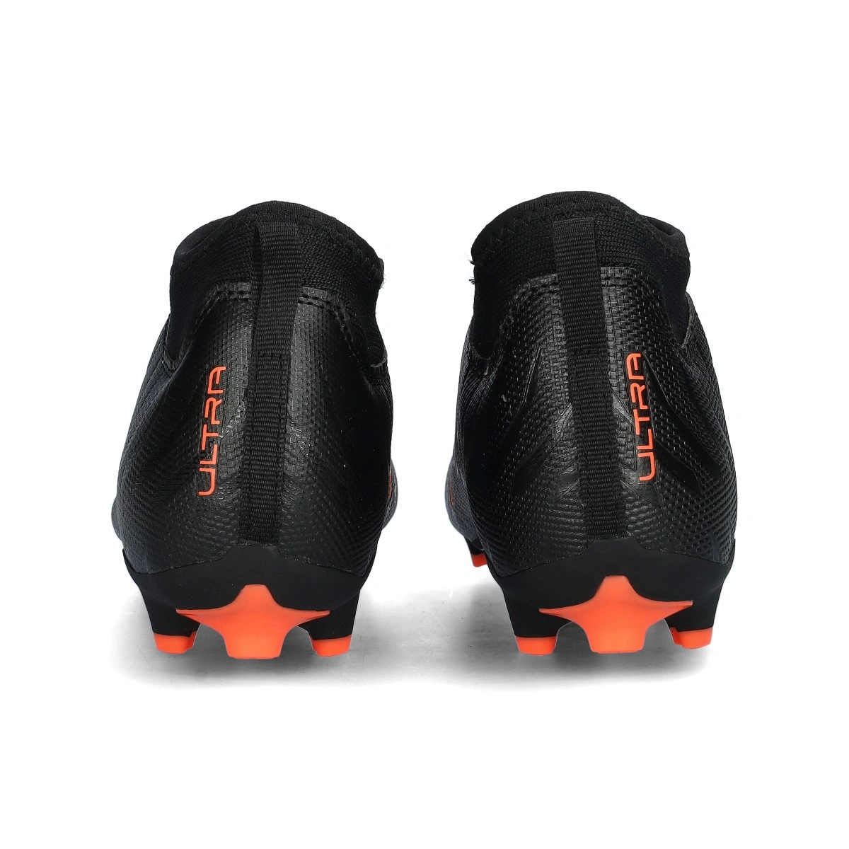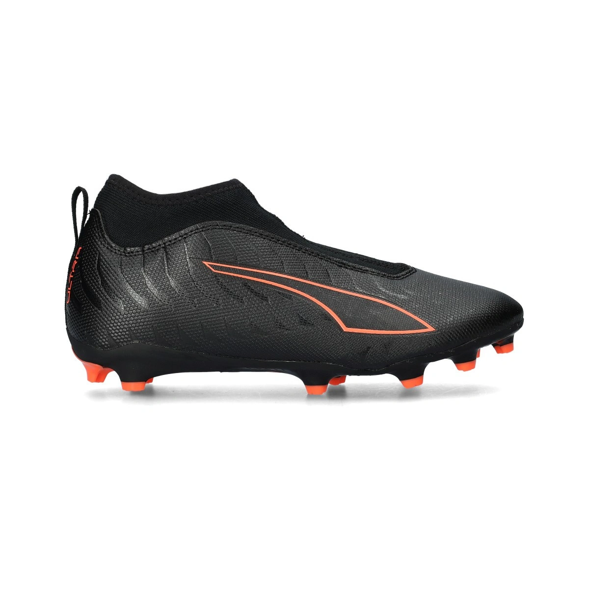 Voetbalschoen Puma Ultra 6 Match+ LL FG/AG voor kind. Synthetische schoenen zonder veters voor gebruik op natuur- en kunstgrasvelden. Instapmodel schoenen in de kleur  Puma Black-Puma Red-Strong Gray.