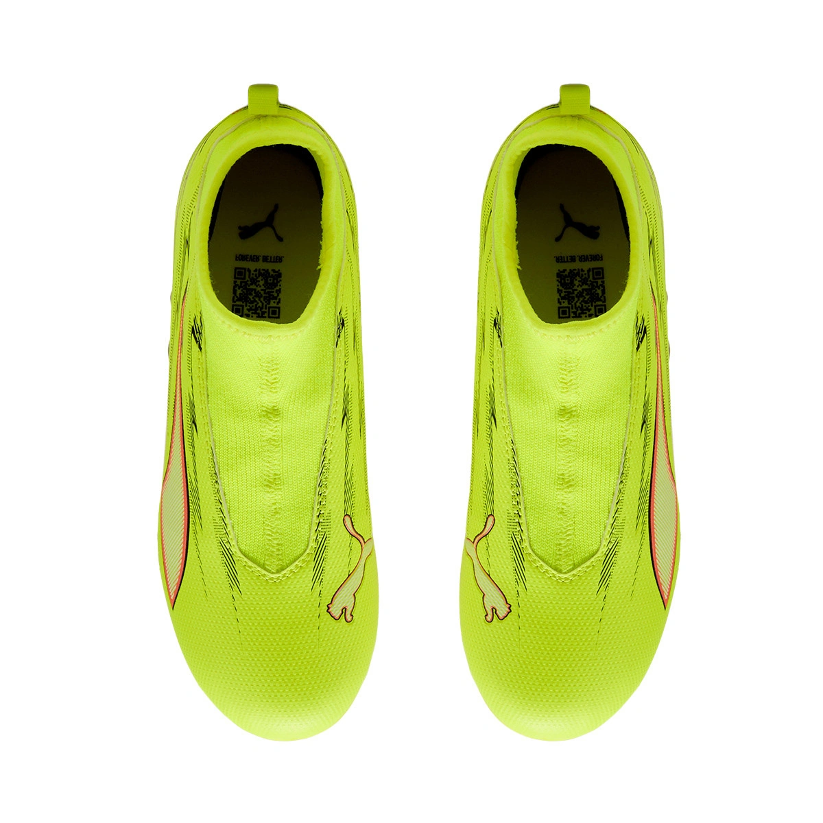 Puma Ultra 6 Match+ LL FG/AG Mid Kind voetbalschoen. Synthetische schoenen voor gebruik op natuur- en kunstgrasvelden. Instapmodel schoenen in de kleur Yellow Alert-Puma Black-Puma Silver-Glowing R.