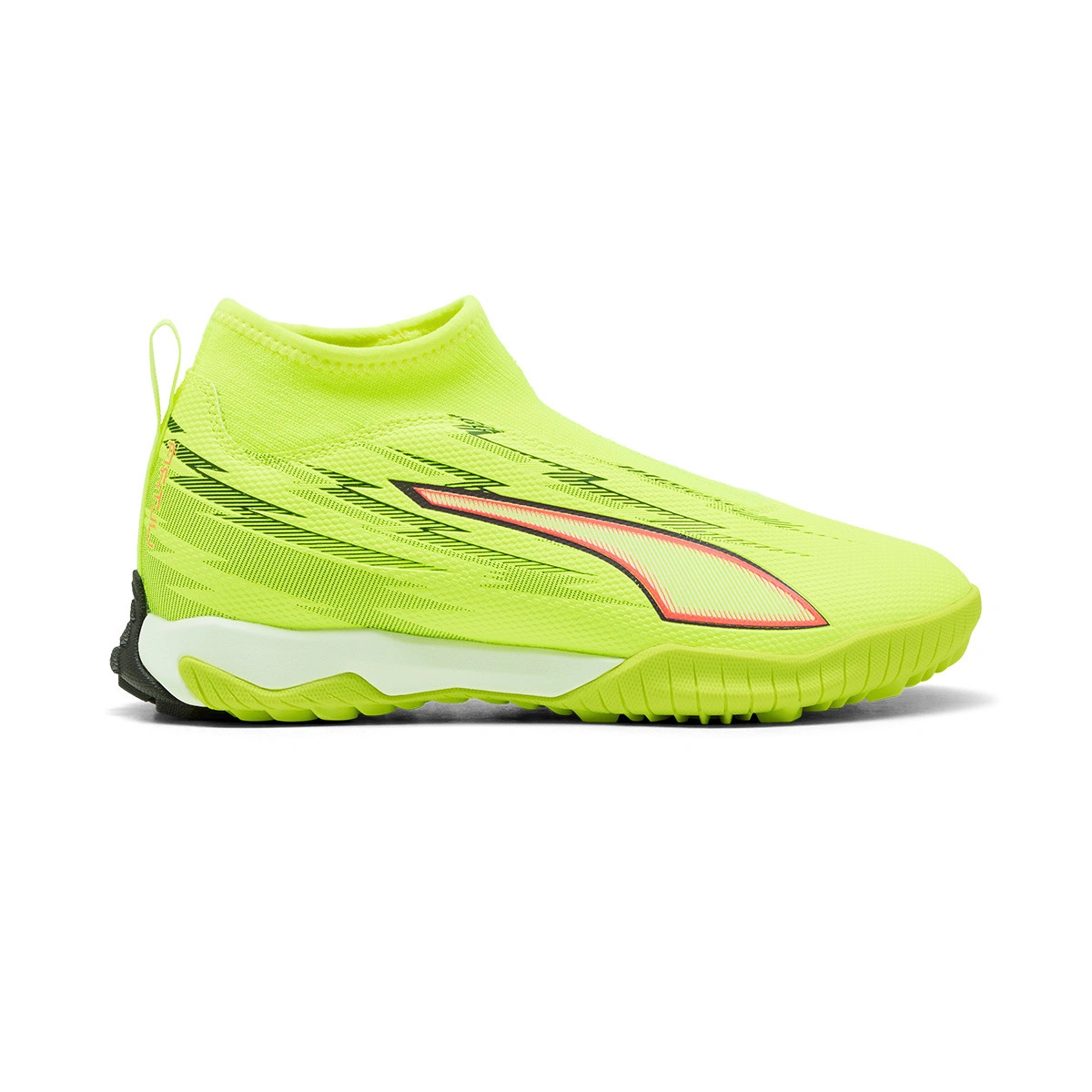 Puma Ultra 6 Match+ LL Turf Mid Kindervoetbalschoen. Synthetische schoenen voor gebruik op kunstgrasvelden of tapijt. Instapmodel schoenen in de kleur Yellow Alert-Puma Black-Puma Silver-Glowing R.