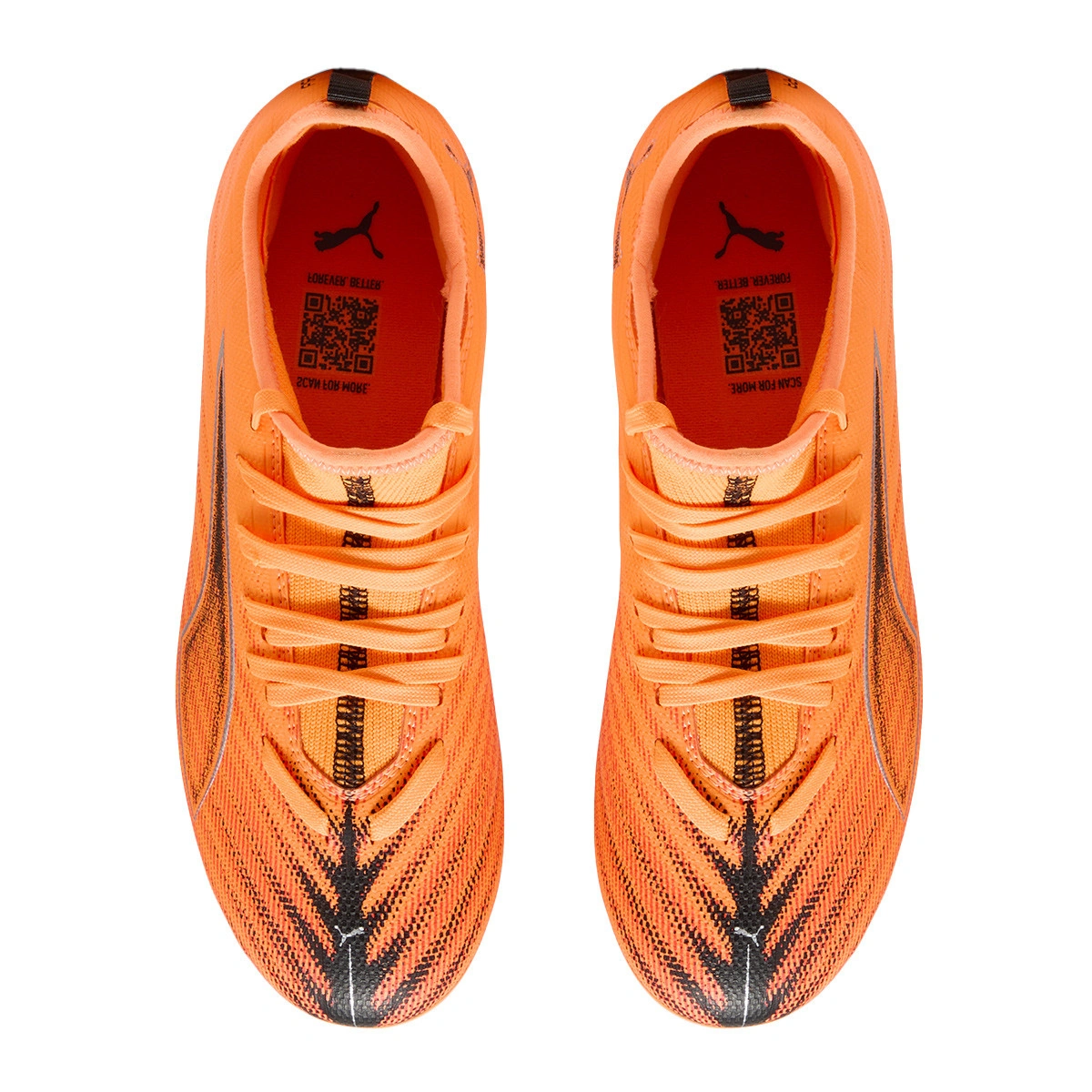 Puma Ultra 6 Match MG voetbalschoenen voor kinderen. Synthetische schoenen voor gebruik op kunstgrasvelden van de eerste generatie. Laagwaardige schoenen in Heat Fire-Black-Glowing Red.