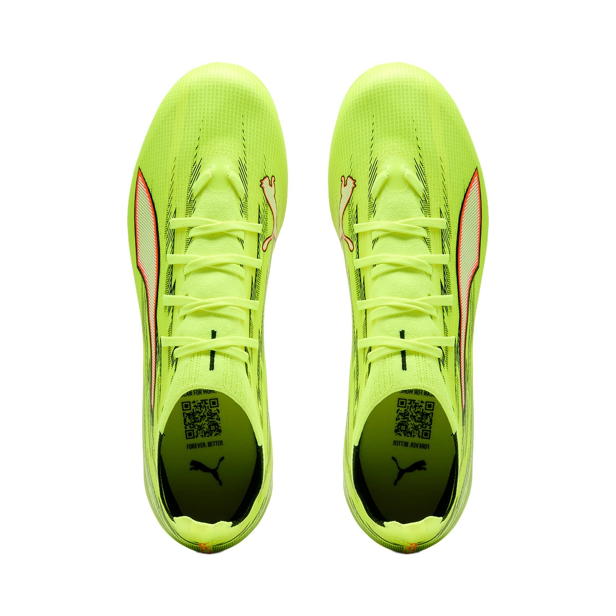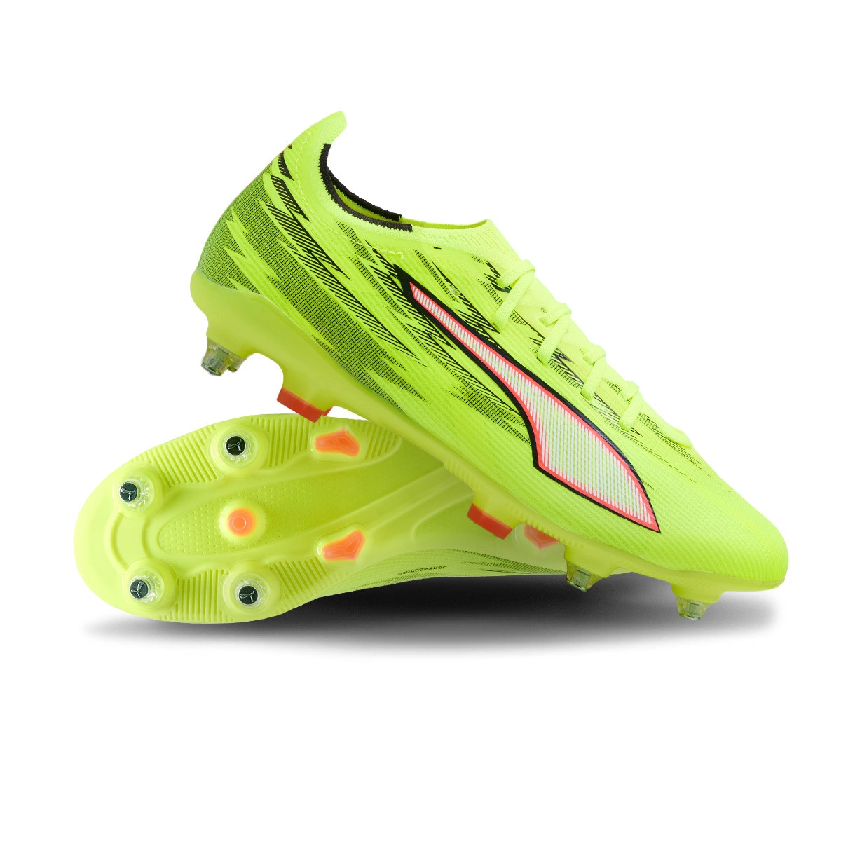 Puma Ultra 6 Match SG voetbalschoen voor volwassenen. Synthetische schoenen voor gebruik op natte natuurgrasvelden. Instapmodel schoenen in de kleur Yellow Alert-Puma Black-Puma Silver-Glowing R.