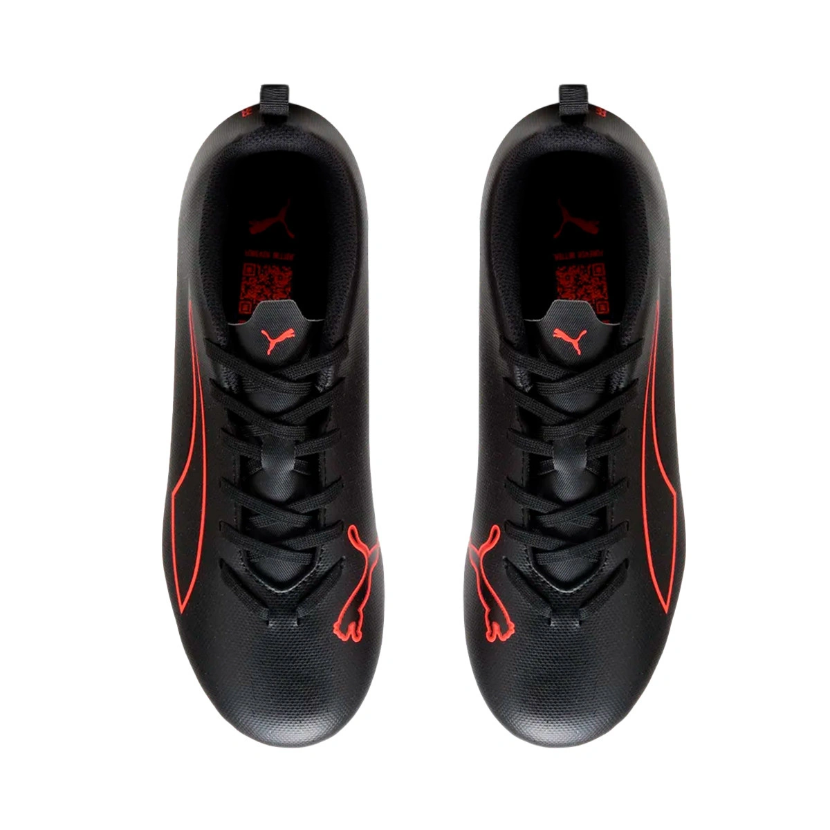 Puma Ultra 6 Play voetbalschoenen FG/AG voor kinderen. Synthetische schoenen voor gebruik op kunstgras en natuurgras. Schoenen uit het instapsegment in de kleur Puma Black-Puma Red-Strong Gray.