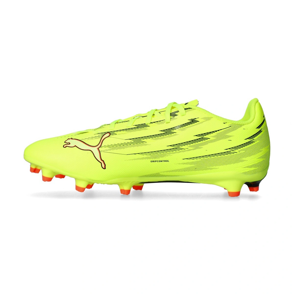 Puma Ultra 6 Play FG/AG voetbalschoen voor volwassenen. Synthetische schoenen voor gebruik op kunstgras en natuurgras. Instapmodel schoenen in de kleur Yellow Alert-Puma Black-Puma Silver-Glowing R.